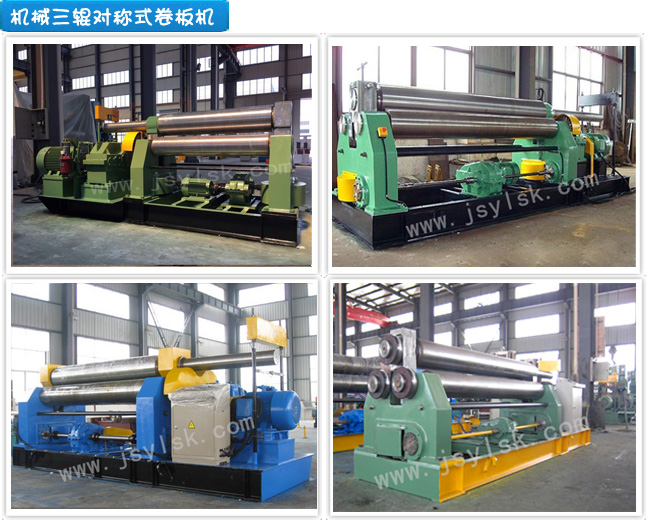 該機結構型式為三輥對稱式,上輥在兩下輥中央對稱位置作垂直升降運動,通過絲桿絲母蝸桿傳動而獲得,兩下輥作旋轉運動,通過減速機的輸出齒輪與下輥齒輪嚙合,為卷制板材提供扭矩。